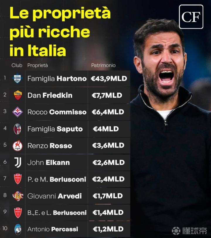 最近,意大利媒体足球与金融根据福布斯的数据,公布了意大利足坛最富有的10大俱乐部老板排行榜。其中,排名第一的是拥有科莫的黄氏家族,他们的财富高达439亿欧元,遥遥领先其他老板。这个排行榜展示了意大利足球俱乐部背后的巨大财富和影响力。